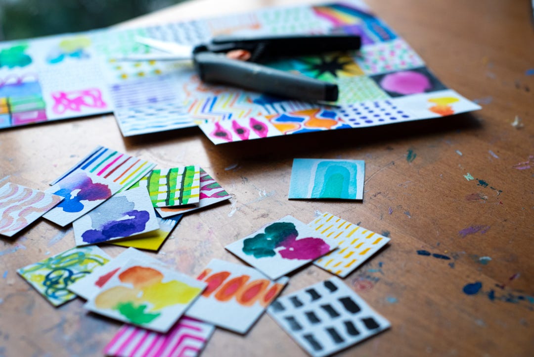 Paint mini abstracts in a grid and then ✂️ for collage. ⤴️ We’ll paint playful abstracts in my new watercolor/gouache workshop. 💁🏻♀️ If you haven’t done so yet, add yourself to the list to “let me know when it opens” and I’ll send you one email when we get started.